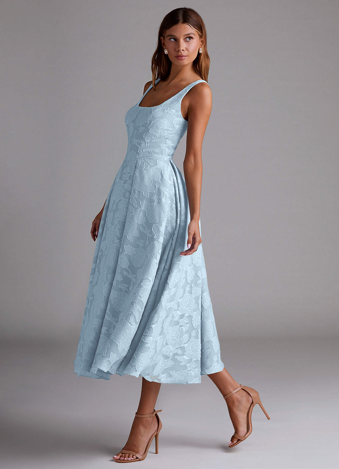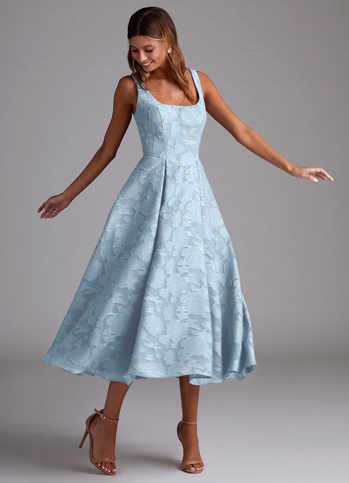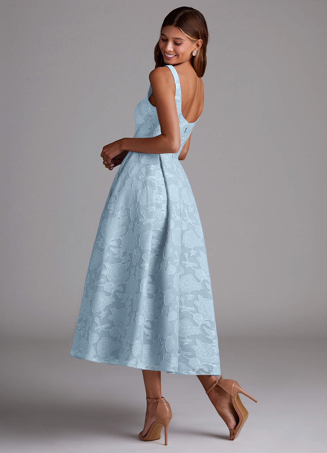 Notre robe de demoiselle d'honneur Amalia est confectionnée dans notre tissu fleuri dévoré dans notre coupe trapèze classique. Elle présente une élégante encolure dégagée associée à une taille pointue. La jupe plissée trapèze est longue comme un thé, avec des poches cachées.