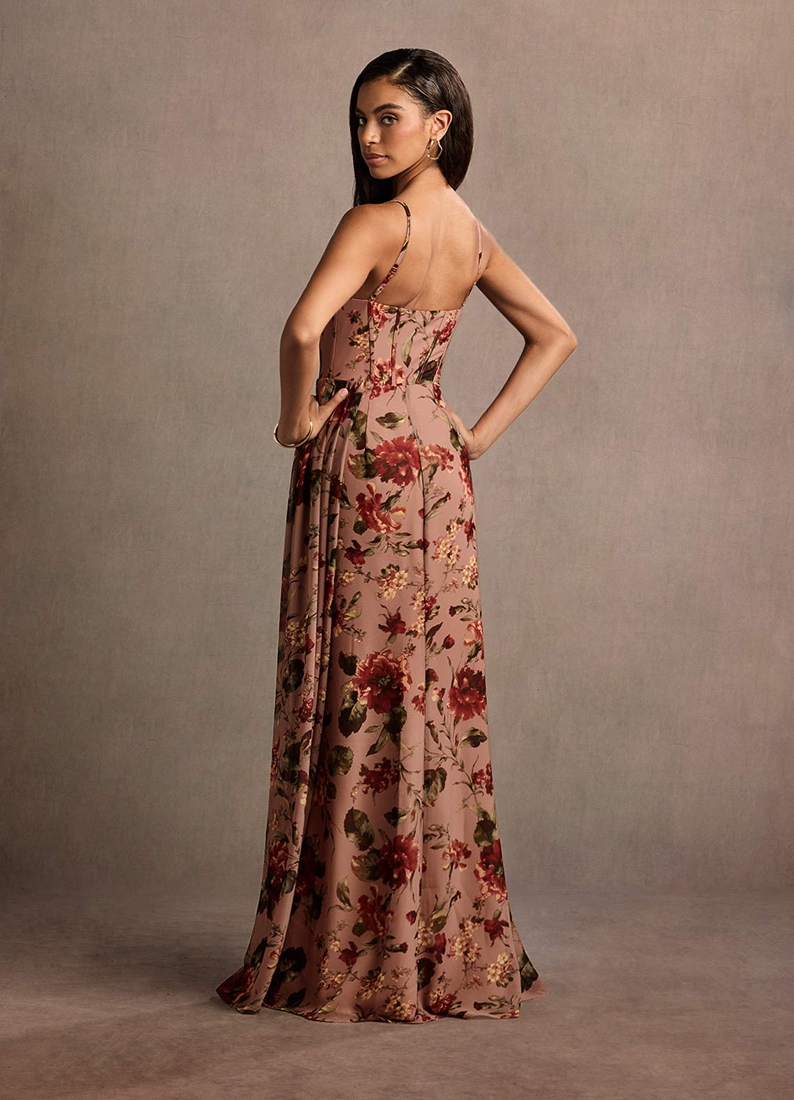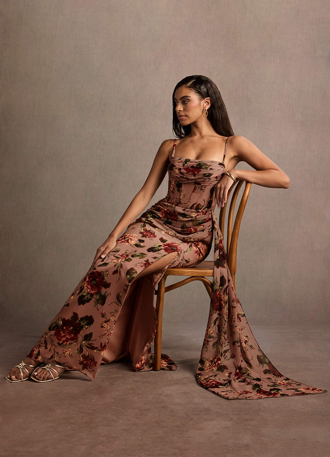 Exprimez votre confiance en vous avec notre robe longue Aurra. Ce modèle en mousseline fleurie présente une encolure plissée, associée à des baleines apparentes à la taille et à une jupe longue drapée. C'est la robe idéale pour votre prochain événement officiel.