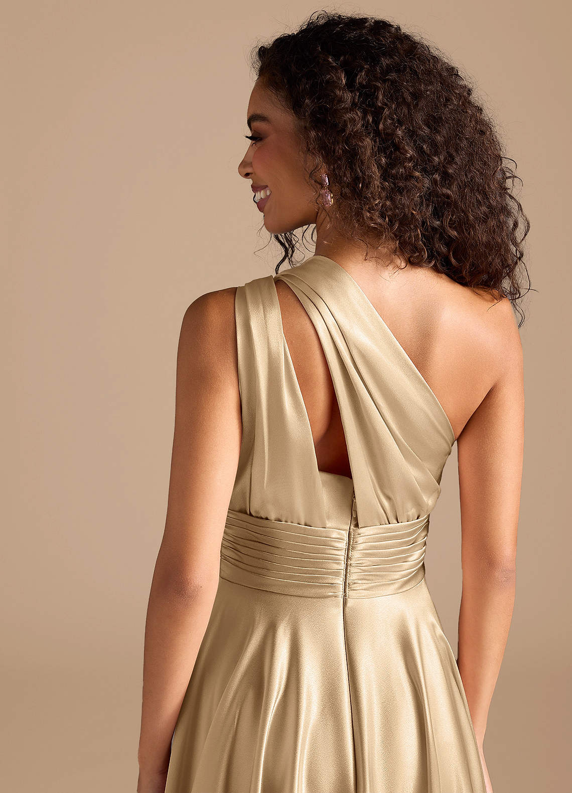 Charlize vous fera sentir comme une déesse grecque moderne ! La robe de demoiselle d'honneur asymétrique présente des panneaux délicatement plissés et un détail d'épaule à nœud torsadé. Le corsage structuré est magnifiquement équilibré avec une jupe trapèze légèrement froncée pour flatter toutes les formes.