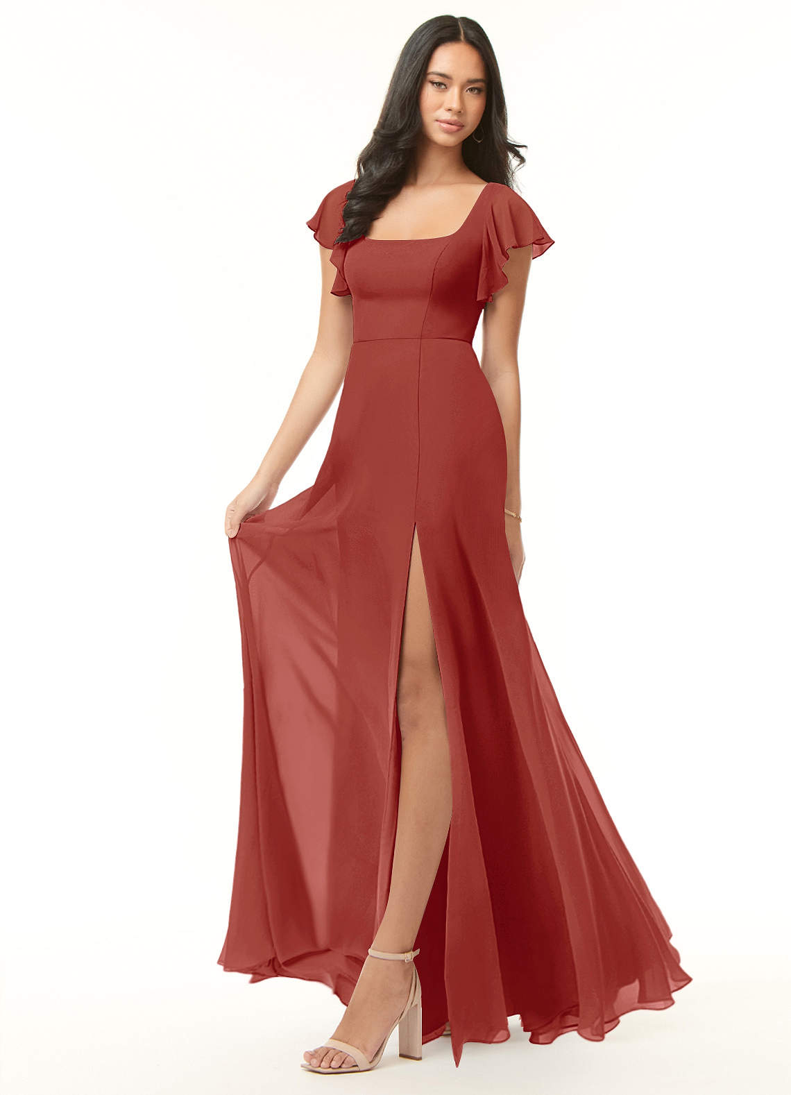 Bondi est notre magnifique robe de demoiselle d'honneur en mousseline. Elle présente une encolure carrée avec des manches flottantes et un dos échancré à nouer. Le look est complet avec une jupe trapèze associée à une fente pour les jambes.