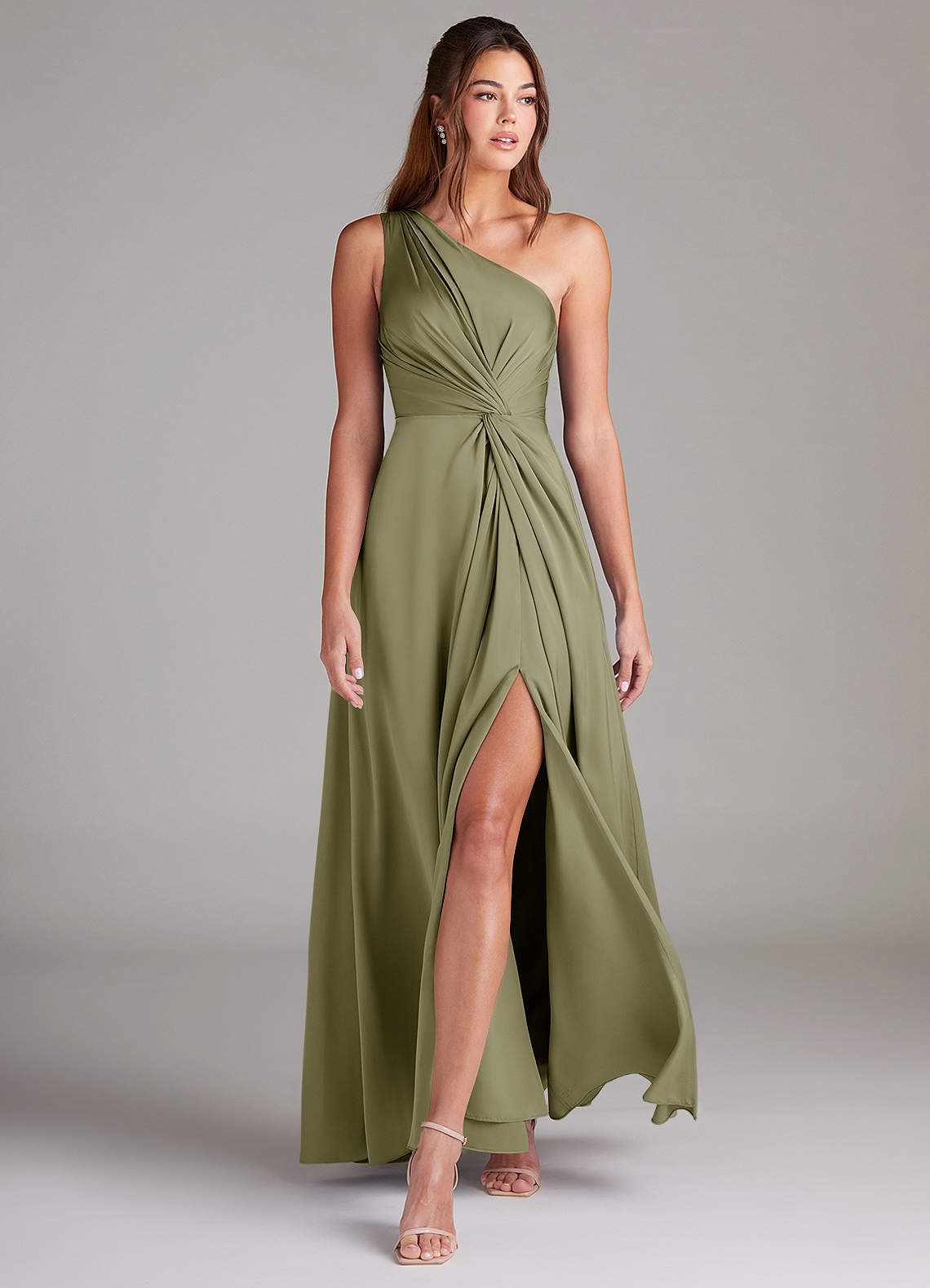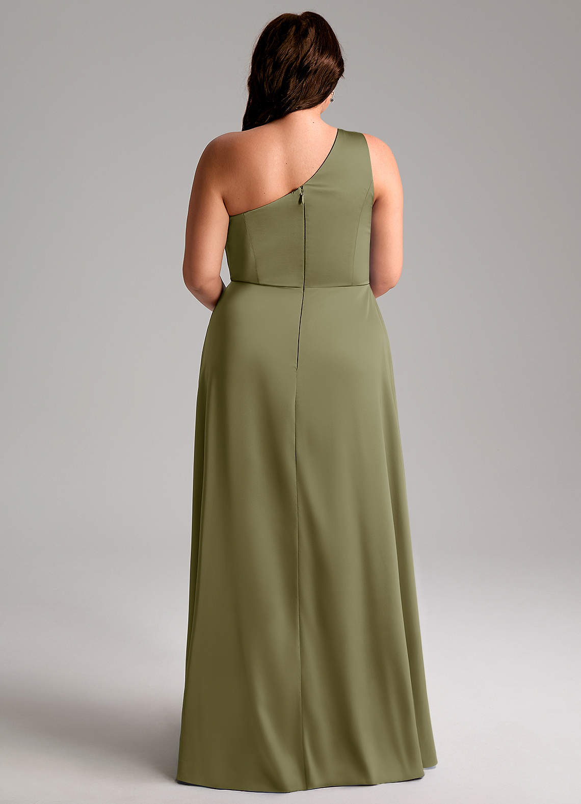 Ressemblez à une déesse grecque des temps modernes en portant Brooke. Cette robe de demoiselle d'honneur à une épaule est faite d'un satin extensible flatteur, donnant à vos demoiselles d'honneur un look d'élégance moderne. Son corsage plissé et son nœud latéral à la taille accentuent la taille, et une fente latérale sur la jambe ajoute une touche séduisante à sa jupe trapèze classique.