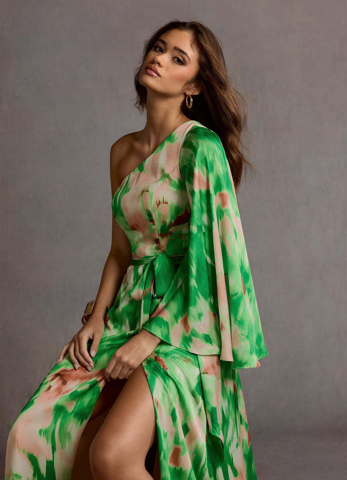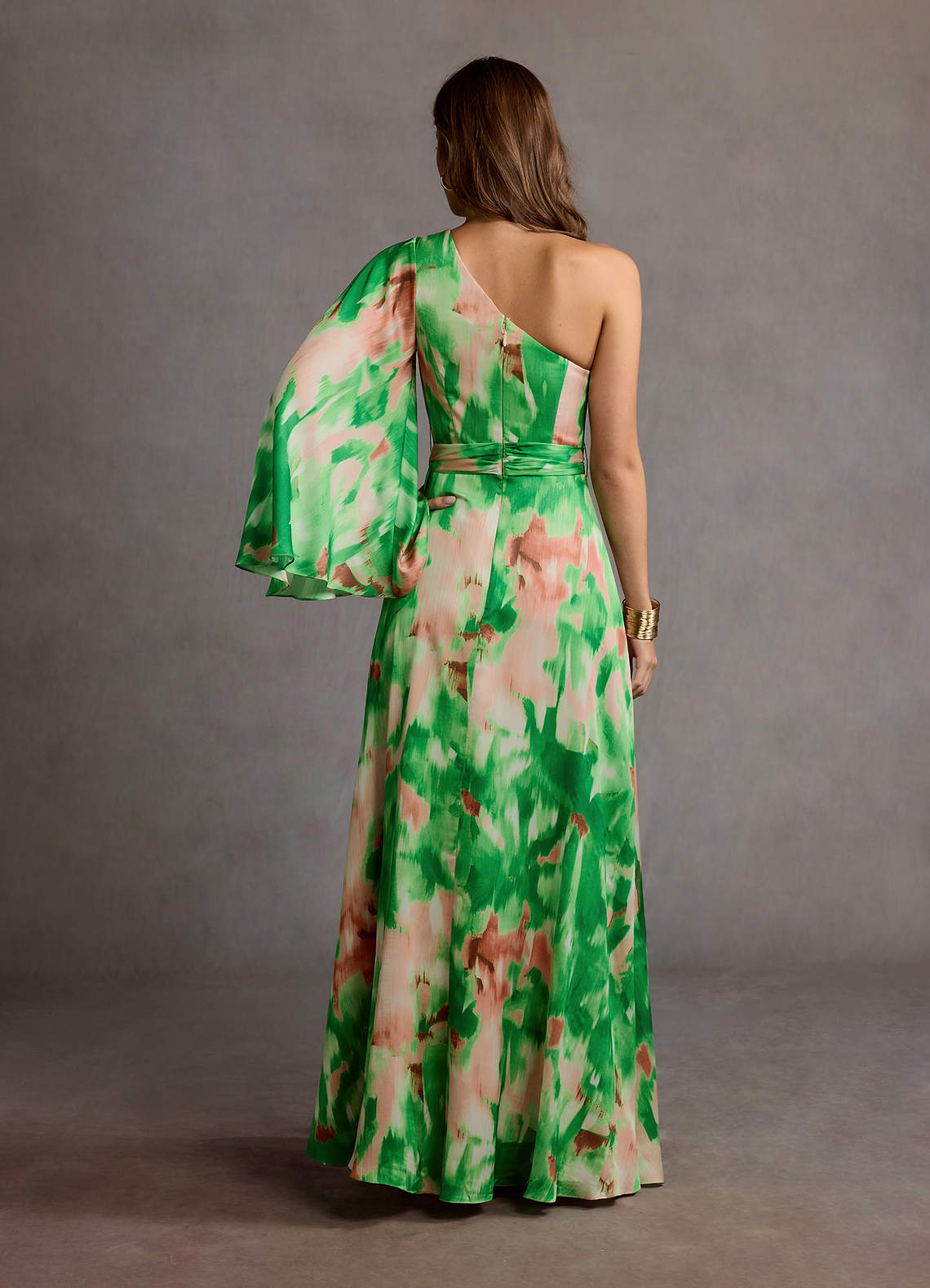 Soyez sur la liste des mieux habillées lors de votre prochain événement en portant notre robe longue Caprice. Ce style vibrant conçu à partir de charmeuse imprimée présente une conception à une épaule complétée par des manches longues volumineuses, une ceinture à nouer et une jupe froncée jusqu'au sol.