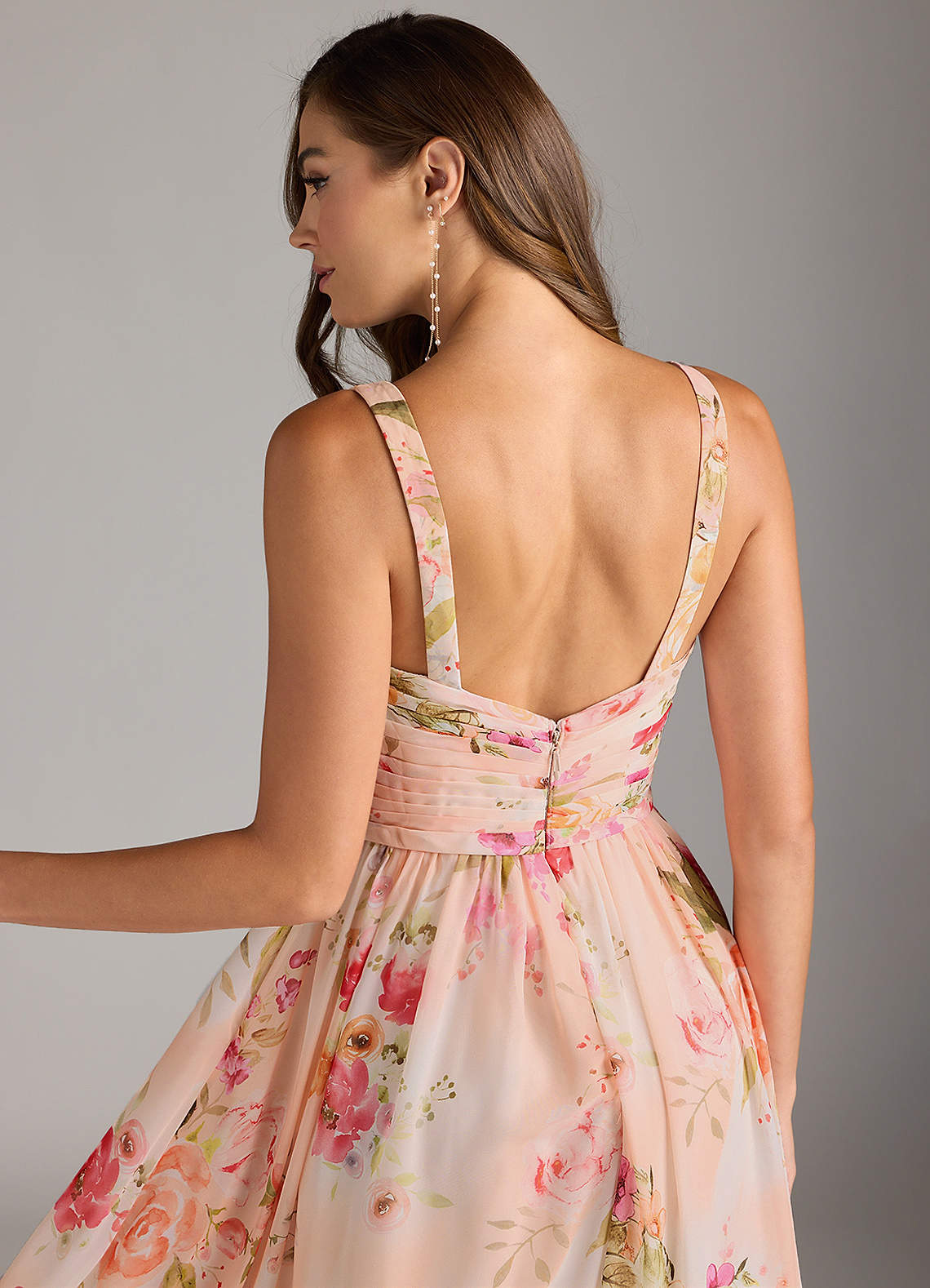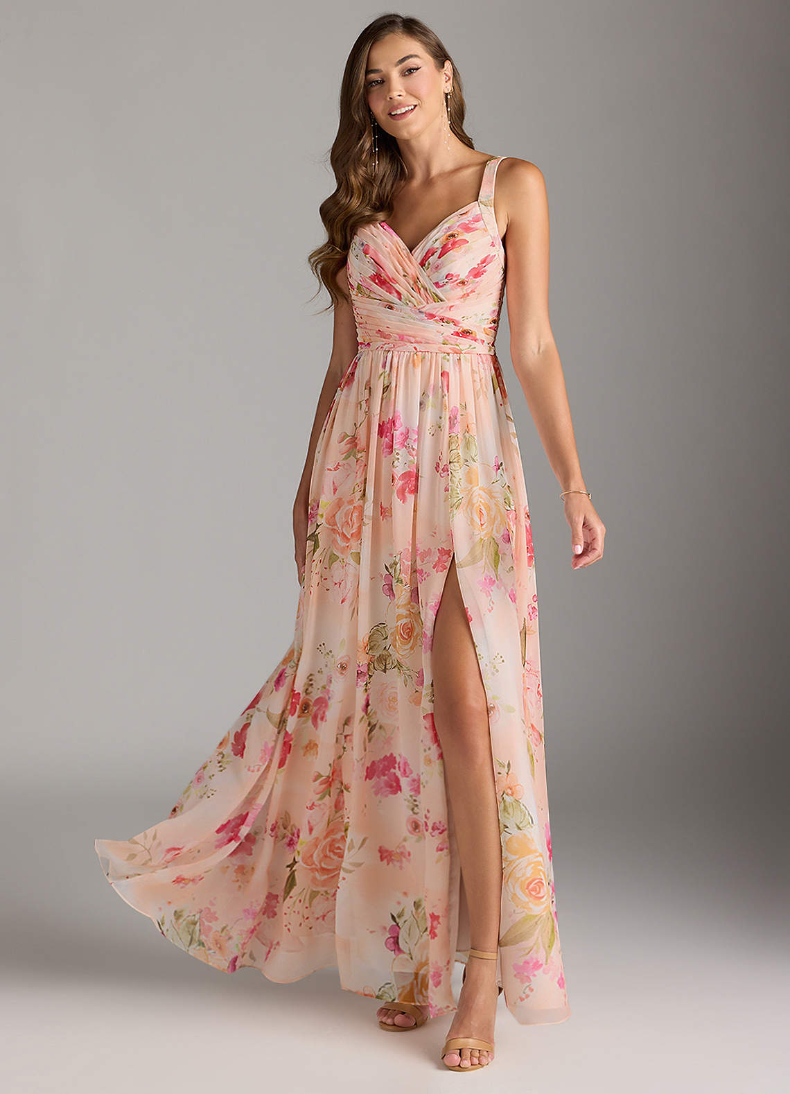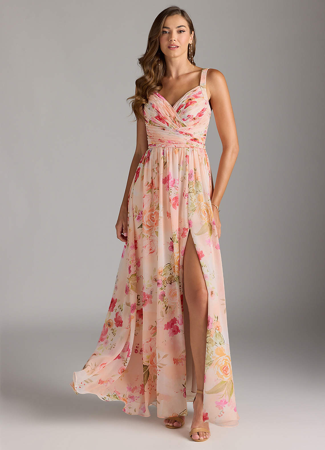 Chanel est une superbe robe de demoiselle d'honneur en mousse de soie. Elle présente un corsage en faux surplis avec une encolure en V et des bretelles. La jupe en ligne droite est froncée et présente une fente pour les jambes.