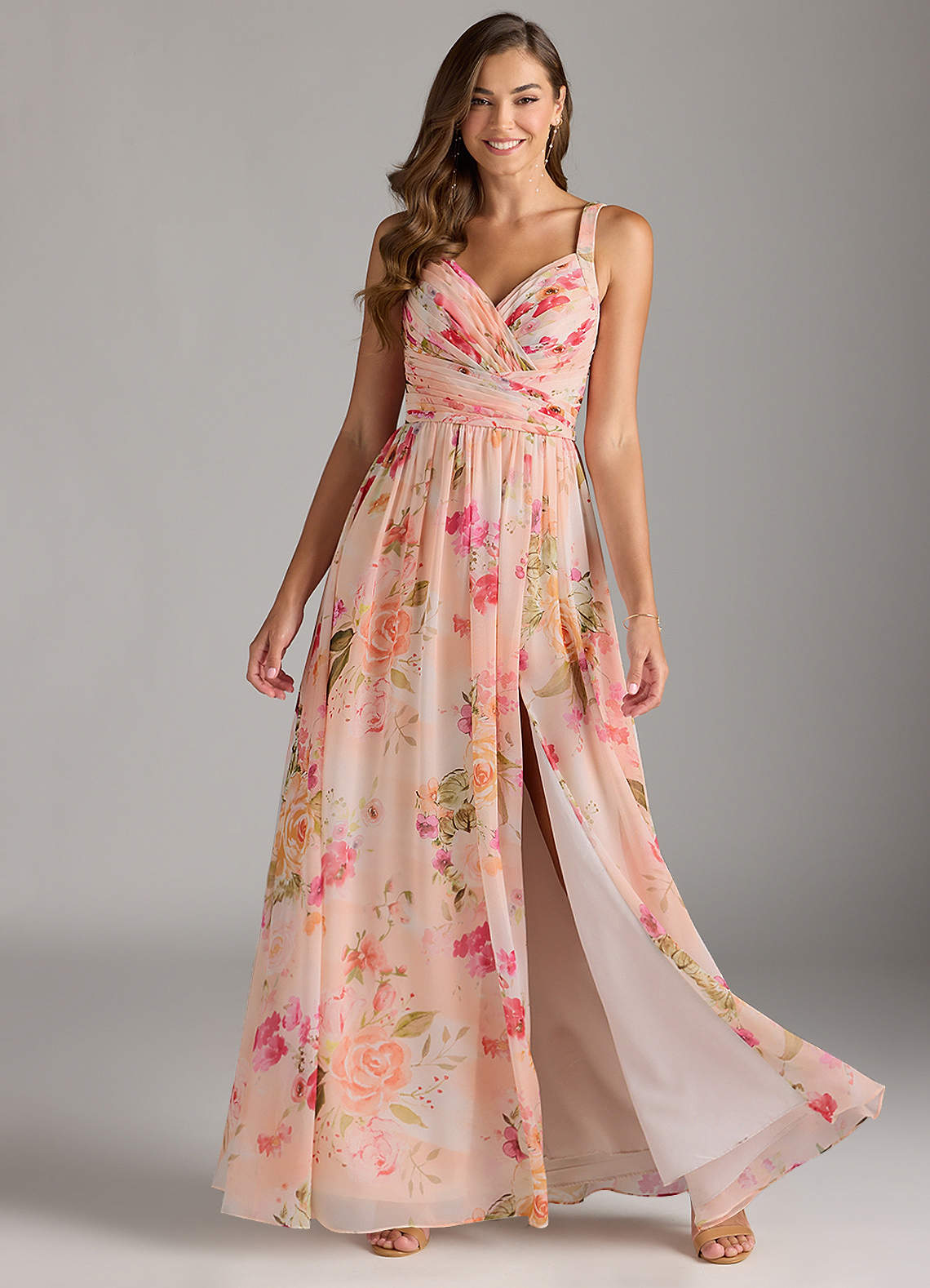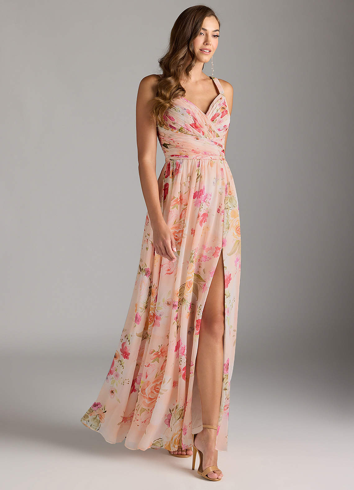 Chanel est une superbe robe de demoiselle d'honneur en mousse de soie. Elle présente un corsage en faux surplis avec une encolure en V et des bretelles. La jupe en ligne droite est froncée et présente une fente pour les jambes.