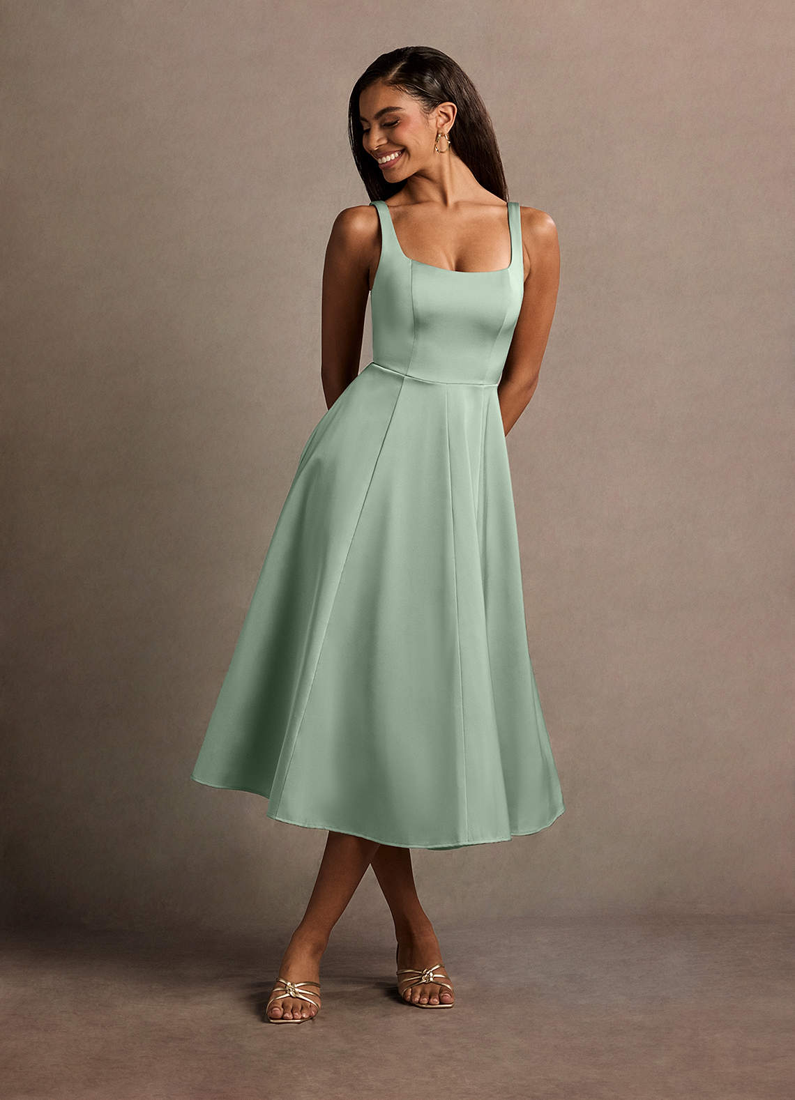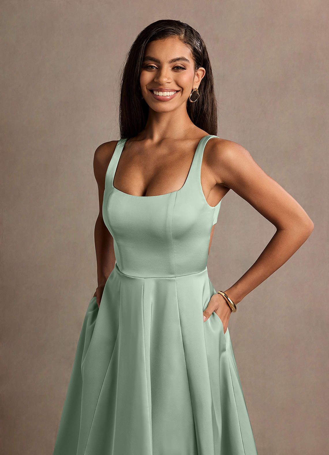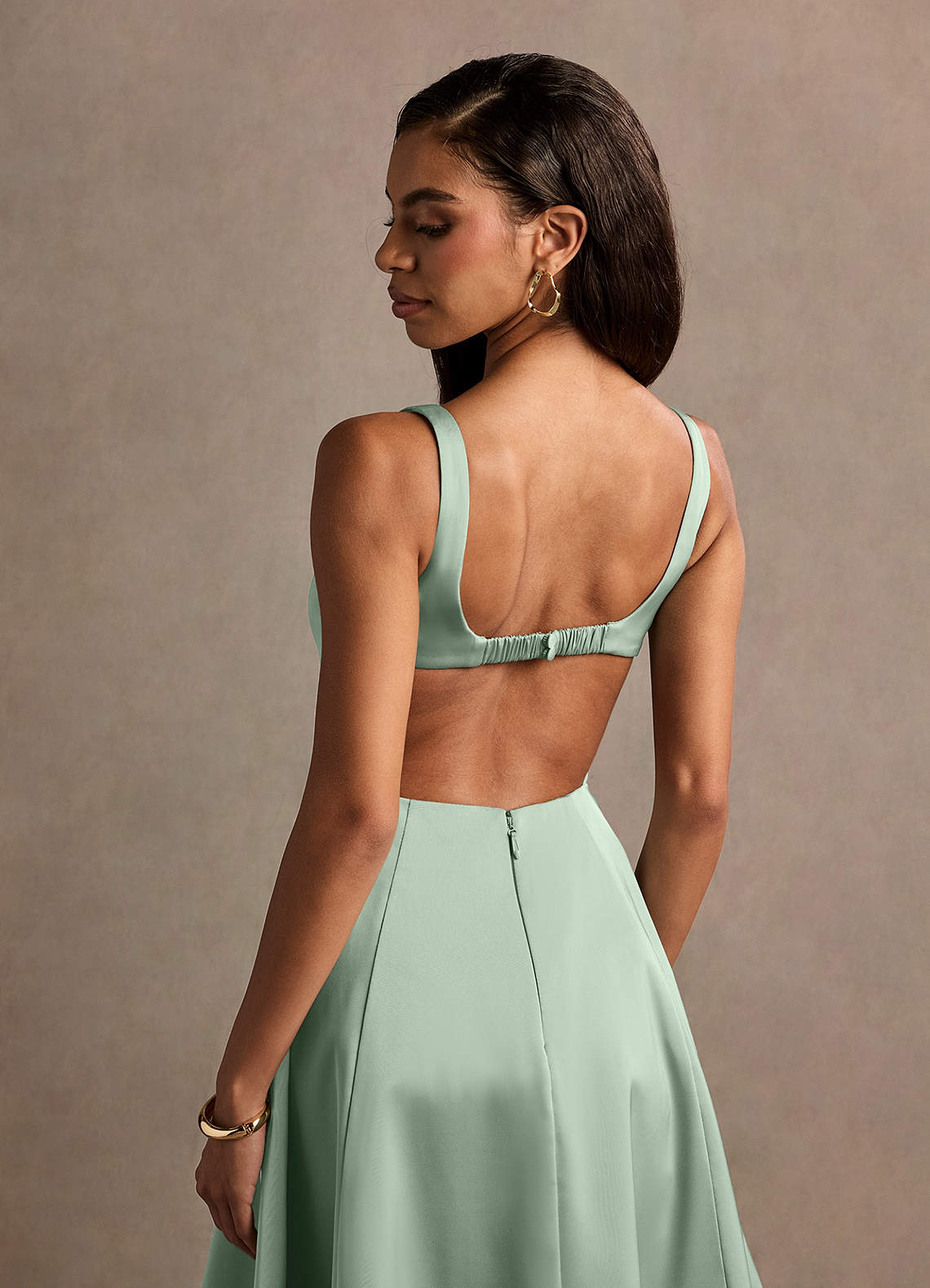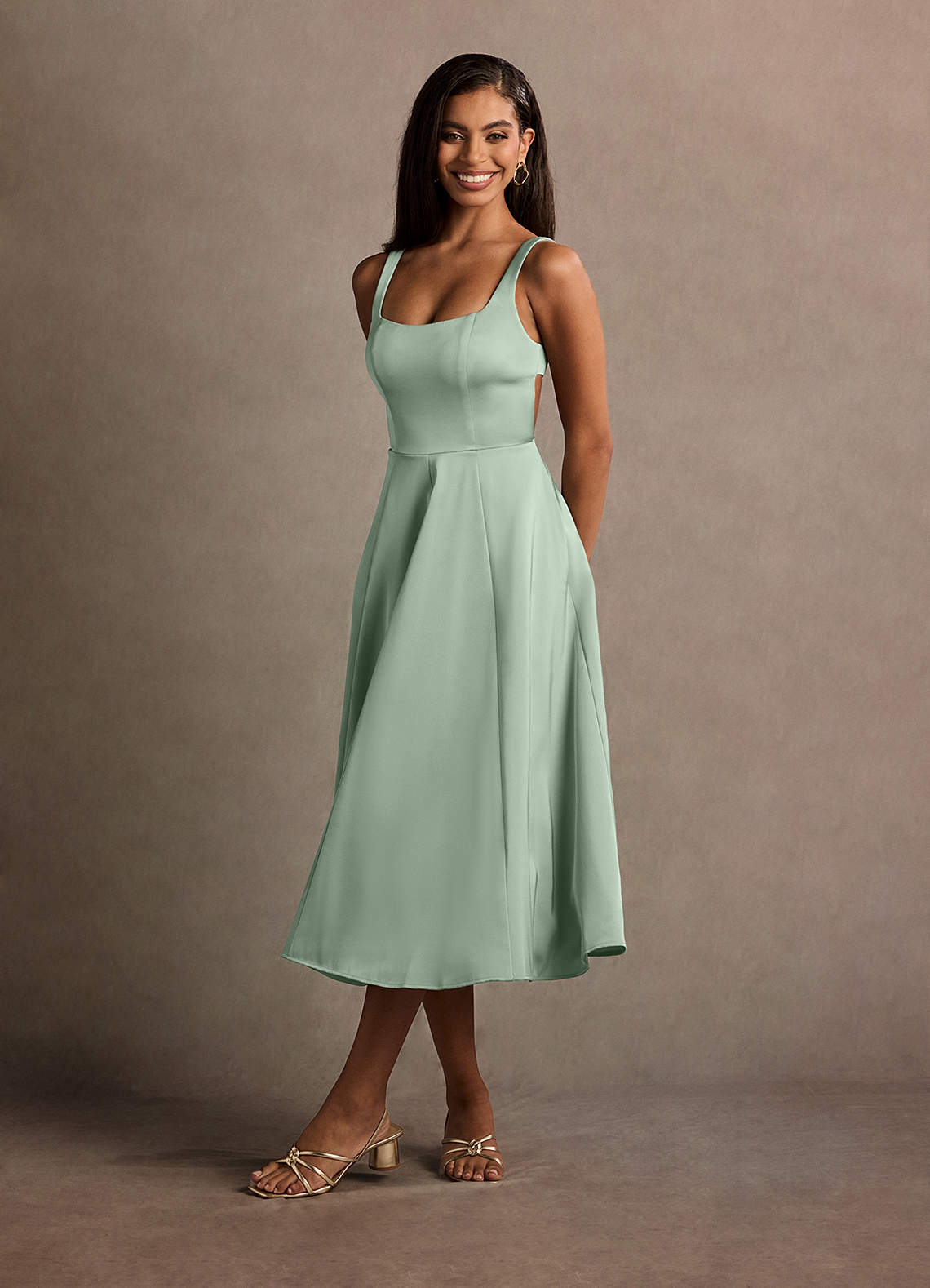 La robe midi Charli à dos ouvert présente une encolure dégagée élégante associée à un design à dos ouvert et une jupe trapèze volumineuse de longueur midi avec des poches cachées. Portez cette robe lors de votre prochain événement formel.