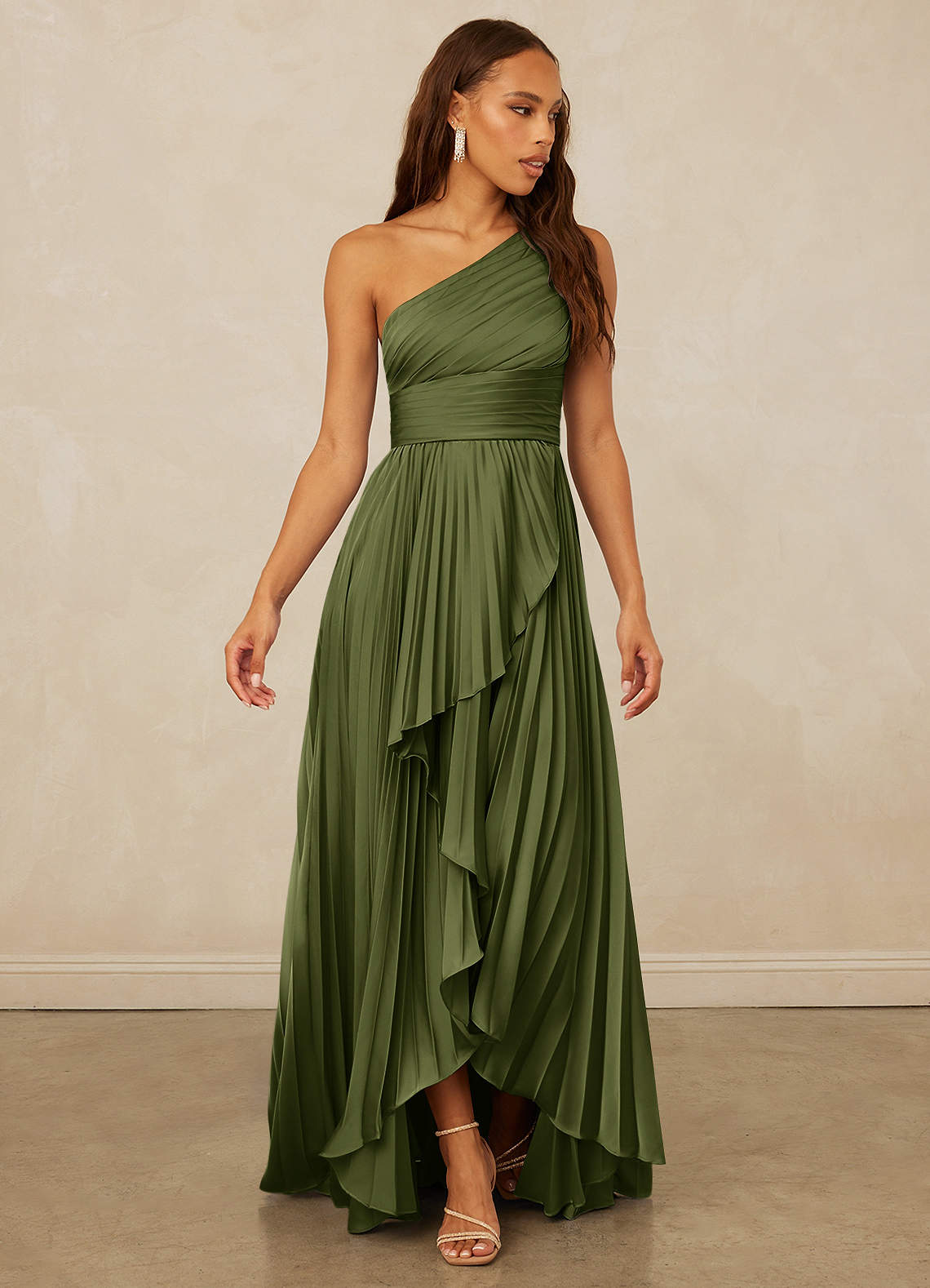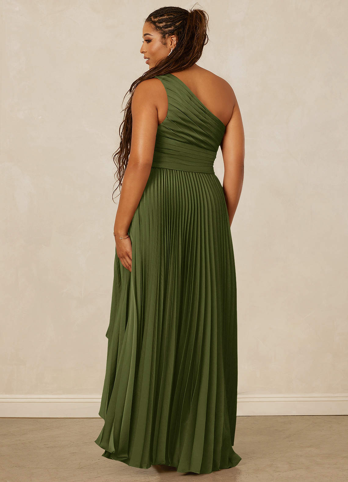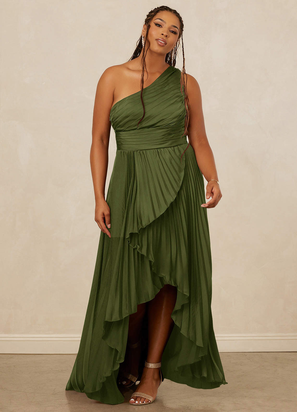 Cette robe longue haute et basse présente une encolure asymétrique, une ceinture plissée à la main et une jupe superposée.