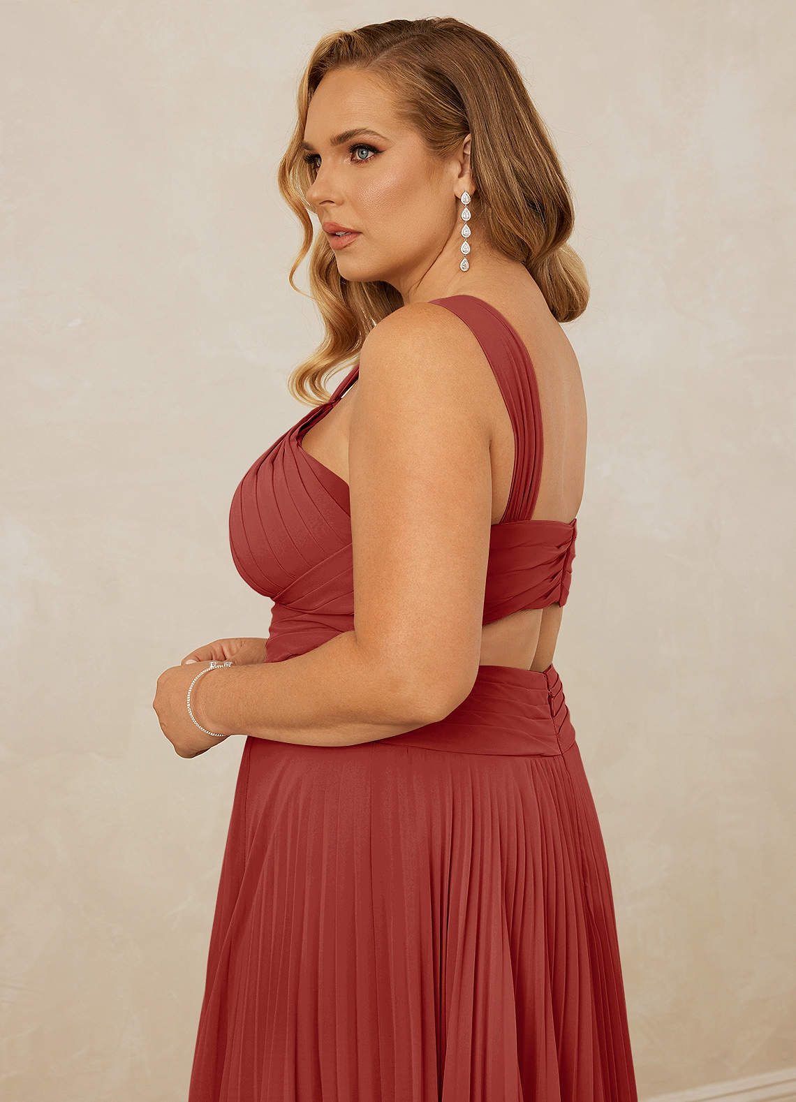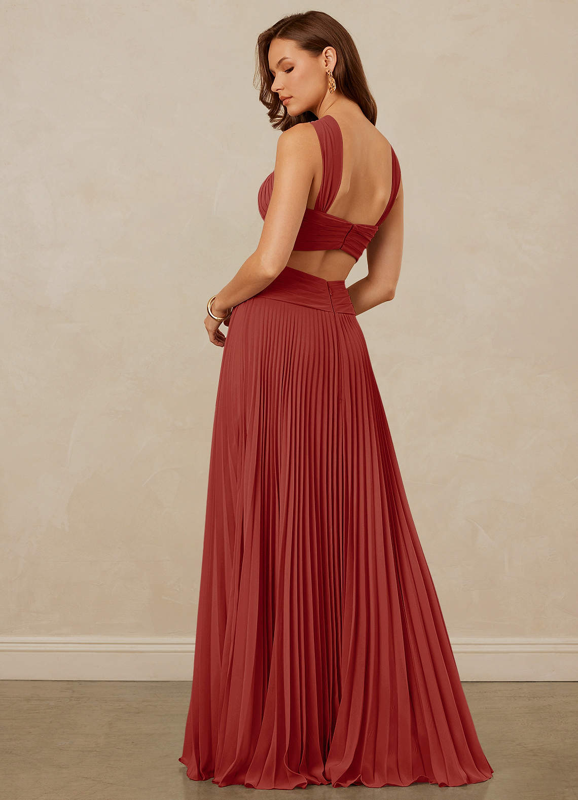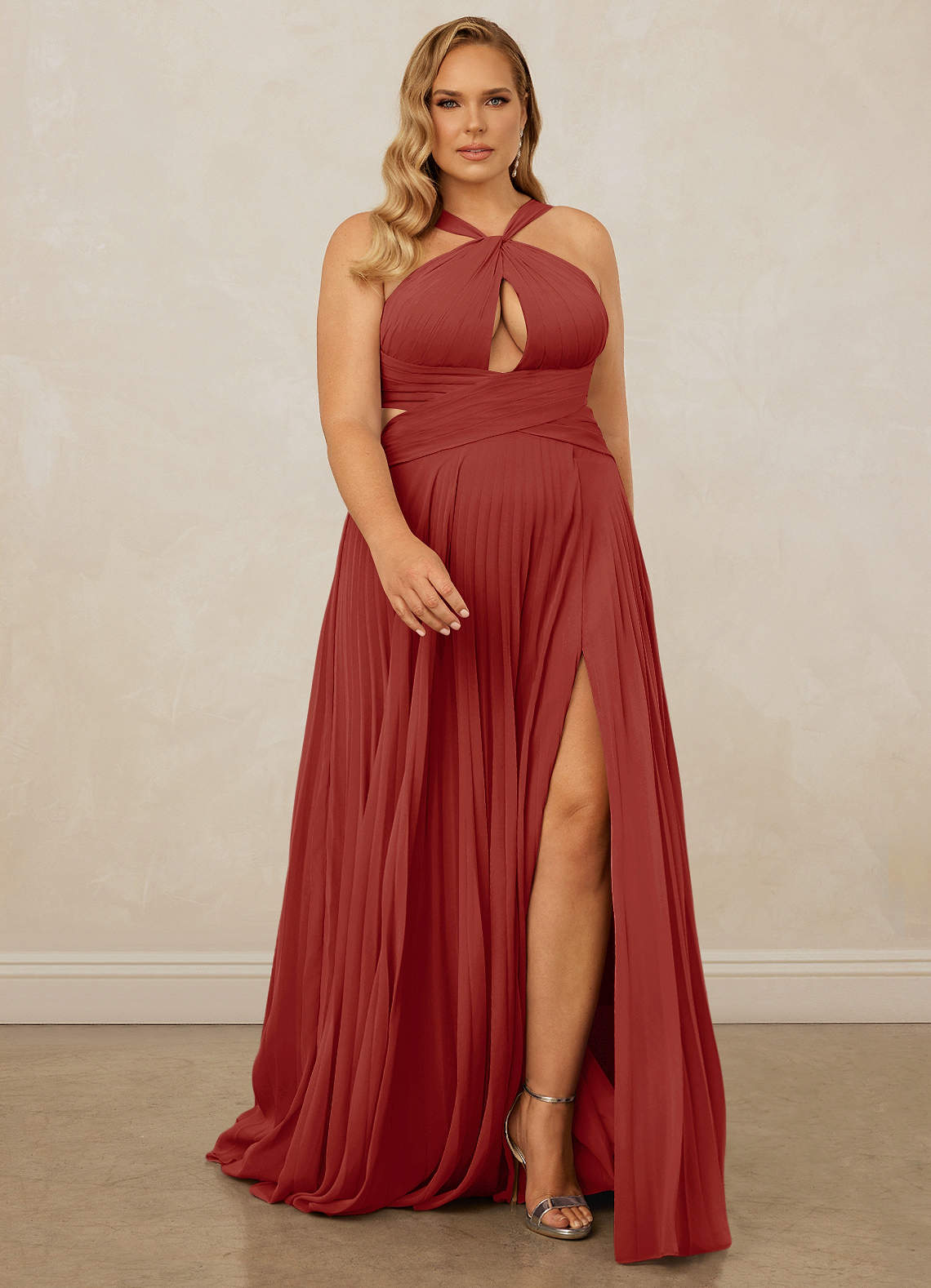 Cette robe en mousseline longue au sol présente un décolleté licou, un corsage plissé, un trou de serrure sur le devant, une découpe dans le dos et une jupe plissée à effet soleil.