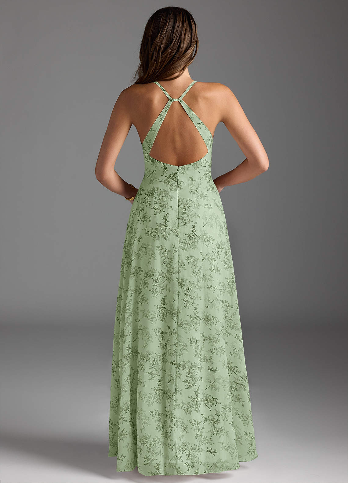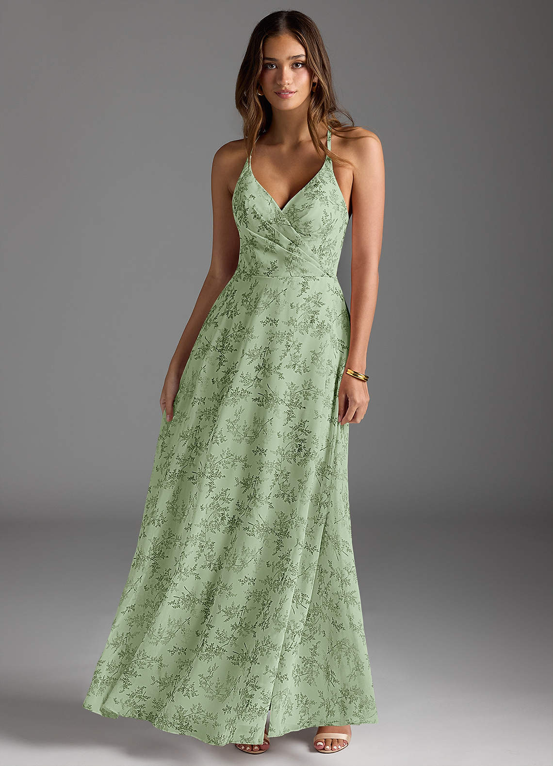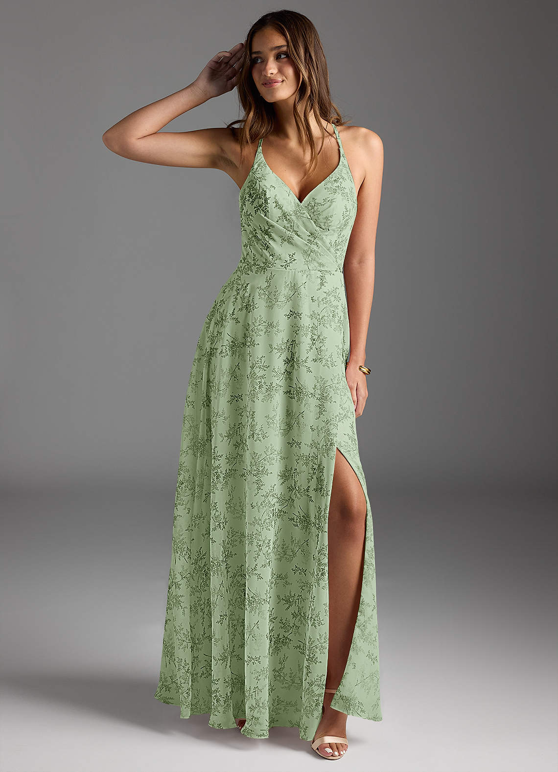 Soyez classique et élégante en portant la robe Davis. Confectionnée en mousseline de soie, elle présente un corsage à encolure en V avec des plis. Sa jupe à la silhouette trapèze est superposée et crée une fente pour les jambes lors de la marche. Ses délicates bretelles spaghetti mènent à un dos ouvert séduisant avec un trou de serrure et une fermeture à bouton recouverte.