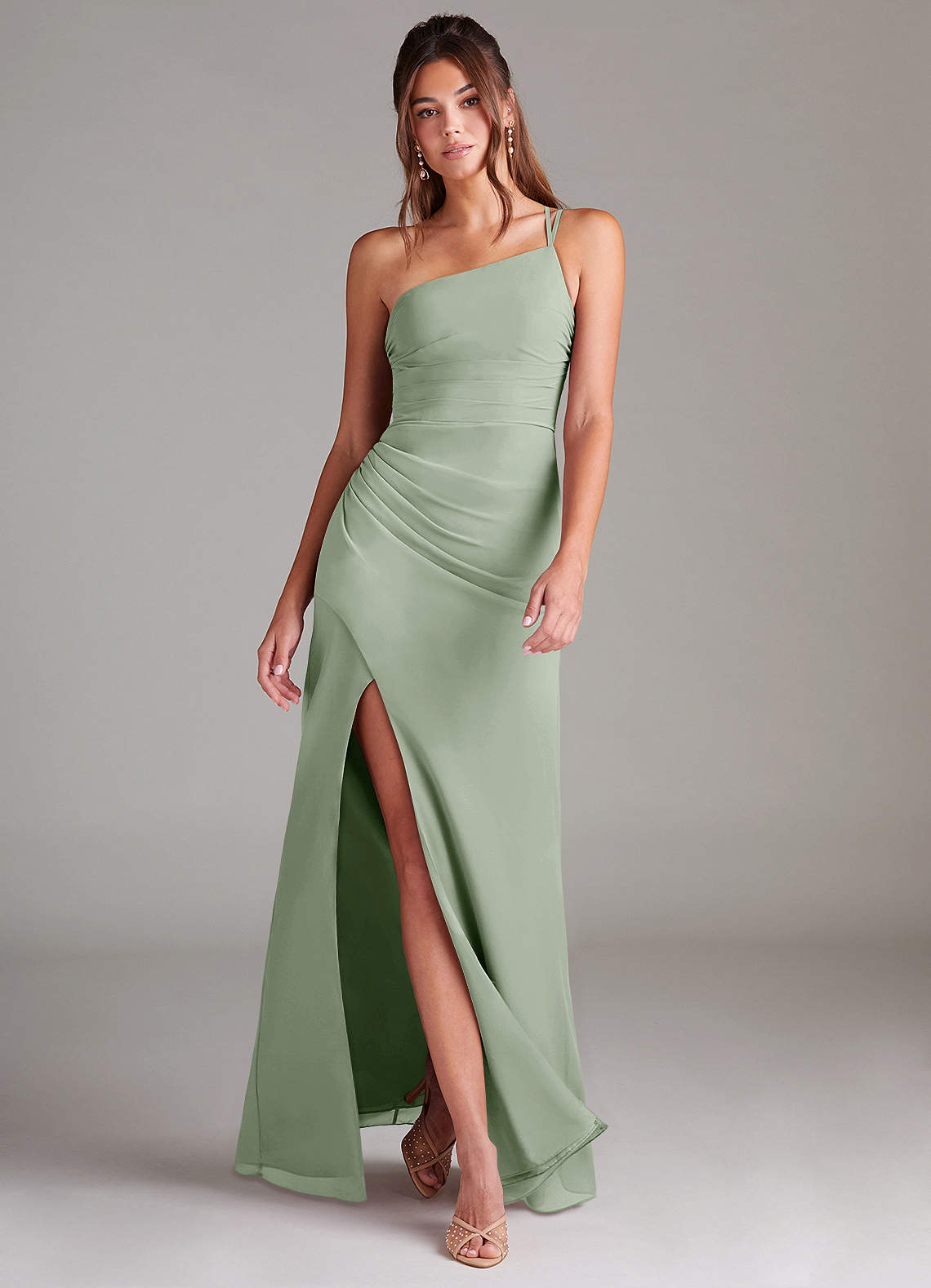 Épatez le cortège nuptial avec notre robe de demoiselle d'honneur en mousseline, Eren. Dotée d'un décolleté asymétrique, cette robe de demoiselle d'honneur est de style asymétrique avec un détail à double bretelle. Les plis commencent au niveau du corsage et descendent jusqu'à la silhouette de la jupe fourreau. Sa jupe plissée drapée se chevauche et crée une fente spectaculaire au niveau des jambes lors de la marche.
