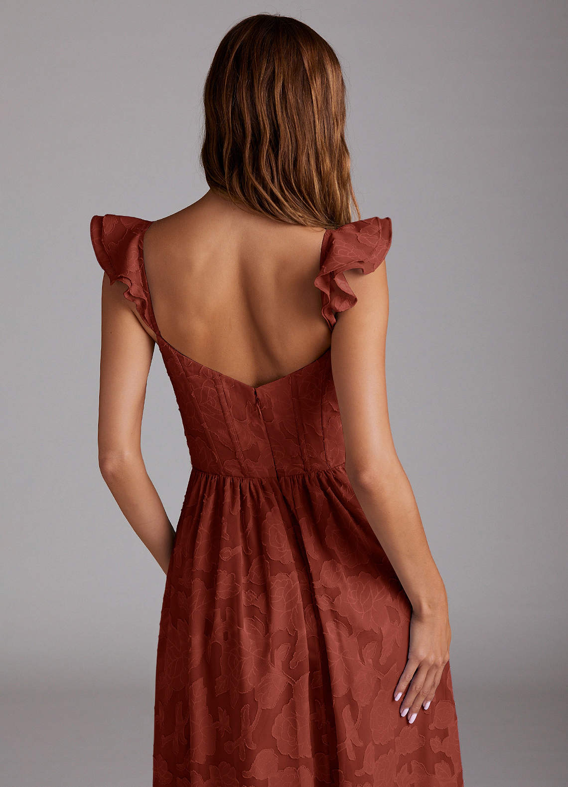 Evelyn est confectionnée dans un magnifique tissu fleuri dévoré, dans notre coupe trapèze classique. Elle présente un décolleté en cœur, des manches flottantes romantiques et un dos nu. La jupe froncée est fendue sur la jambe pour une plus grande liberté de mouvement.