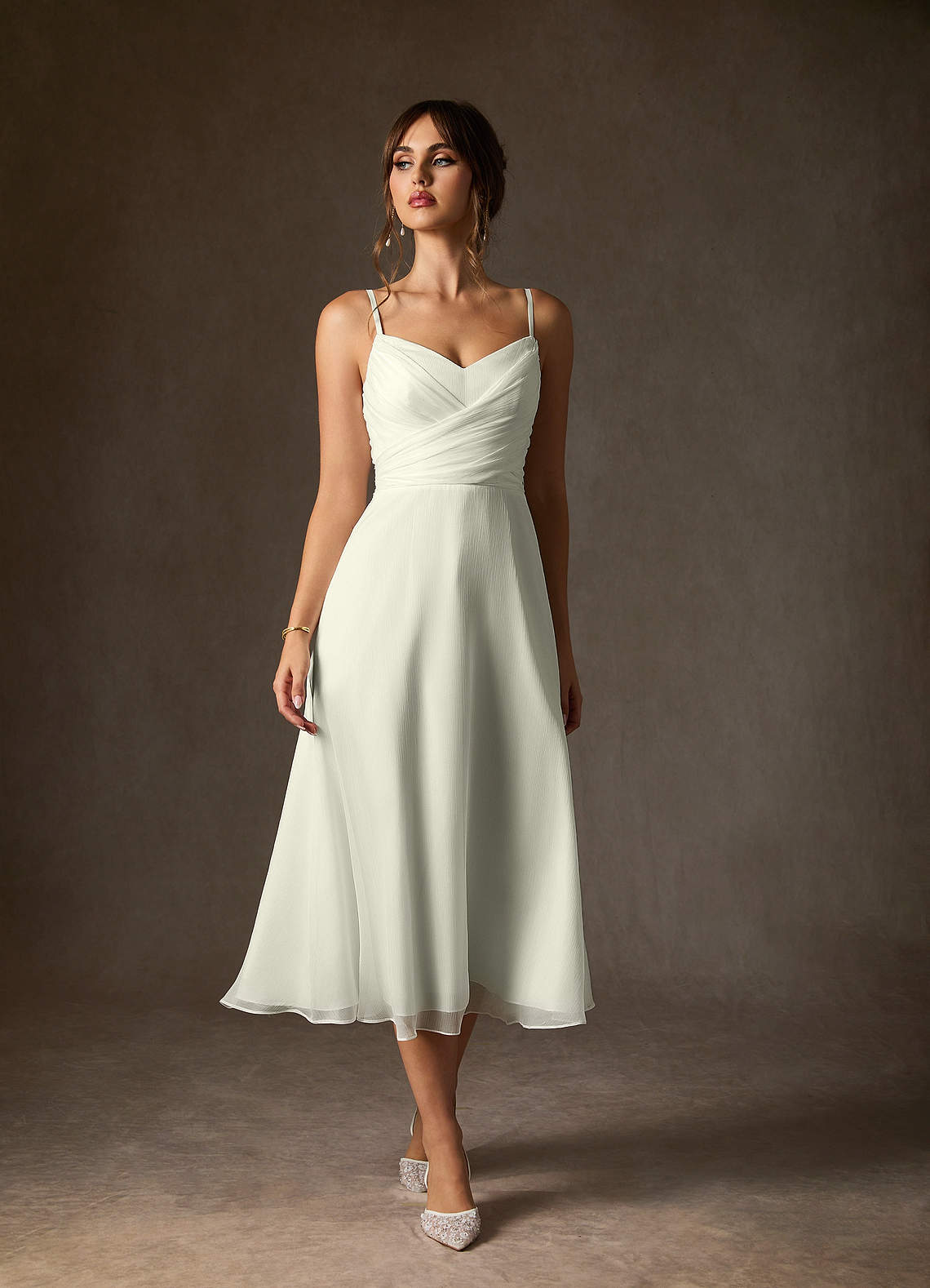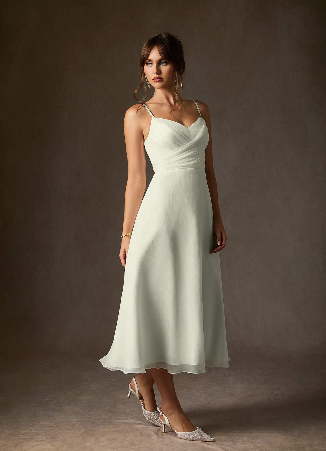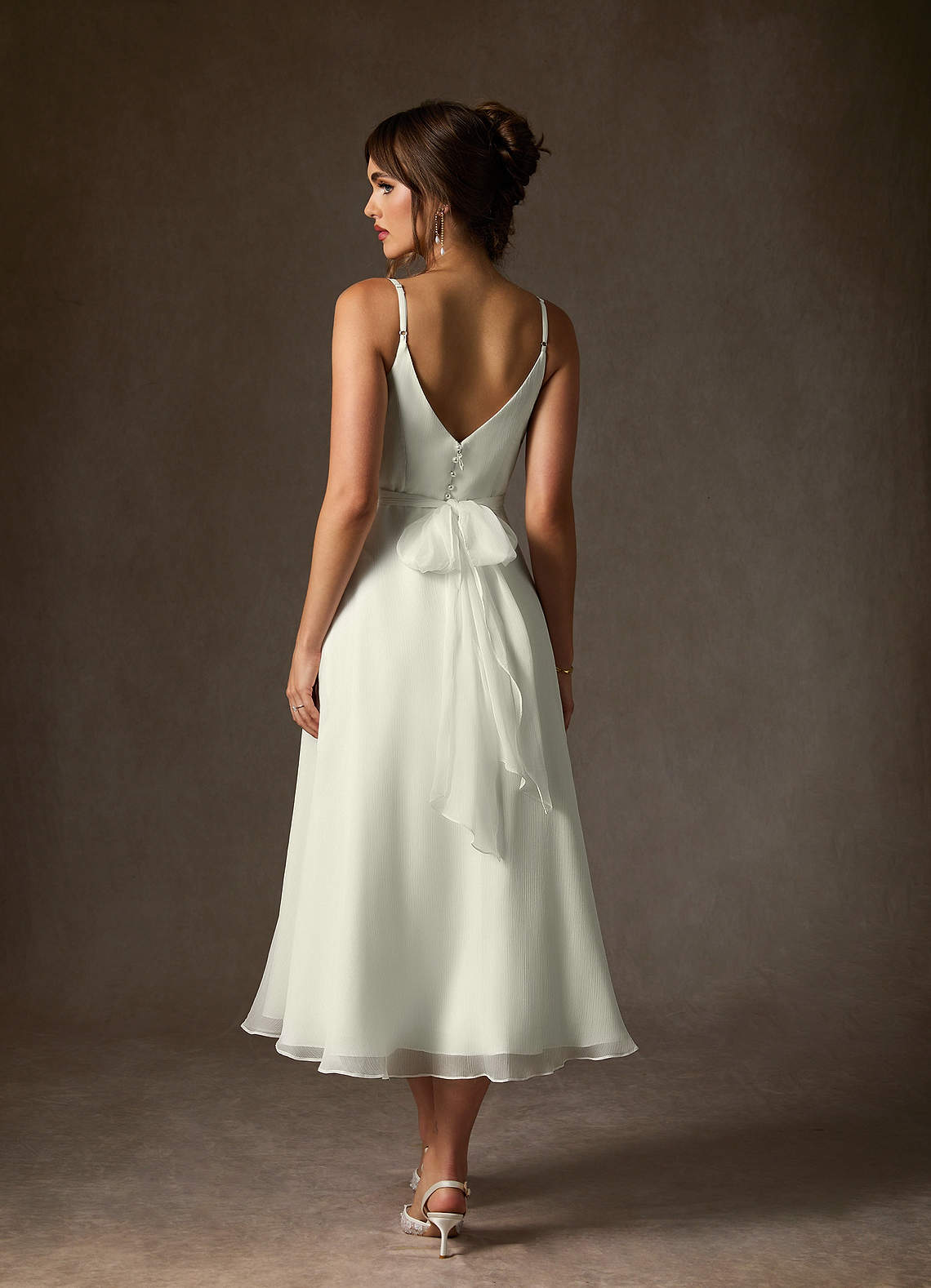Profitez de votre minimonie en portant Kali, notre robe trapèze en mousseline froissée. Son décolleté en V est maintenu en l'air par des bretelles spaghetti attirant votre attention sur le magnifique dos en V. Le corsage comporte des panneaux latéraux plissés qui s'enroulent autour créant un superbe détail d'attache dans le dos. Boutonnée dans le dos avec de fausses perles qui captent la lumière, cette robe a été conçue pour une fin heureuse.