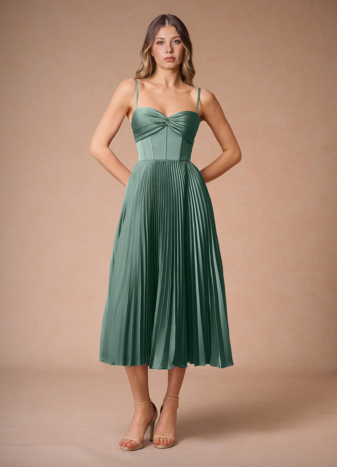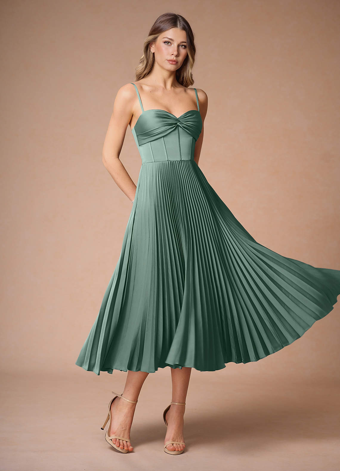 Notre robe midi plissée Léna est confectionnée en satin extensible. Elle présente un décolleté en V, des bretelles spaghetti réglables et une jupe trapèze plissée. Portez-la lors de votre prochain événement.