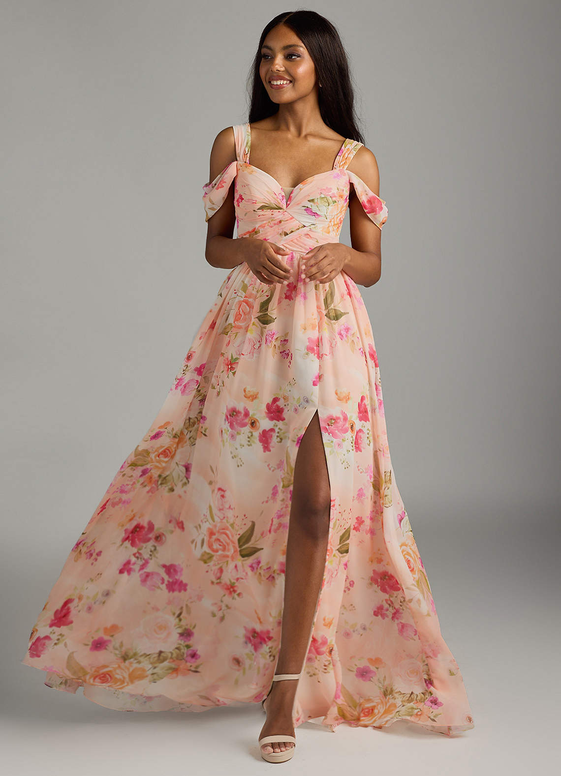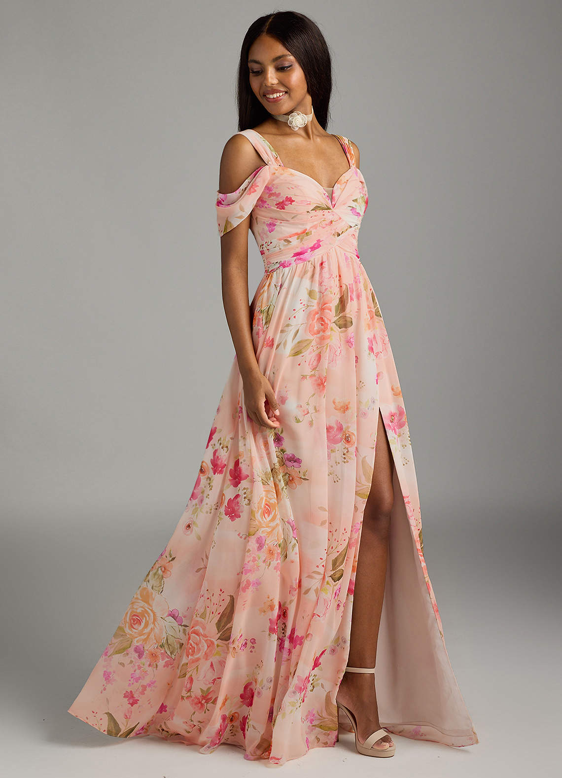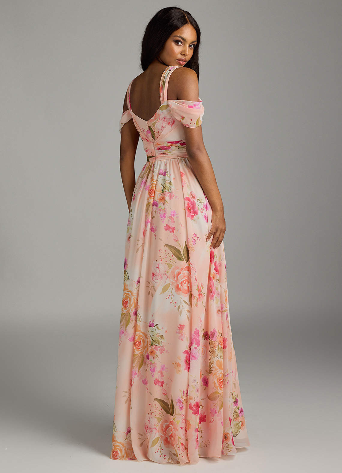 Ayez l'air exquis en portant Lianne. Confectionnée en mousse de soie, elle présente des bretelles débardeur reliées par des bretelles transparentes à épaules dénudées soutenant un corsage ajusté. Son décolleté en cœur plongeant est conçu avec des détails plissés élégants. Des plis supplémentaires encerclent délicatement une taille empire, et sa jupe longue longue au sol est stylée avec une fente latérale séduisante sur la jambe.