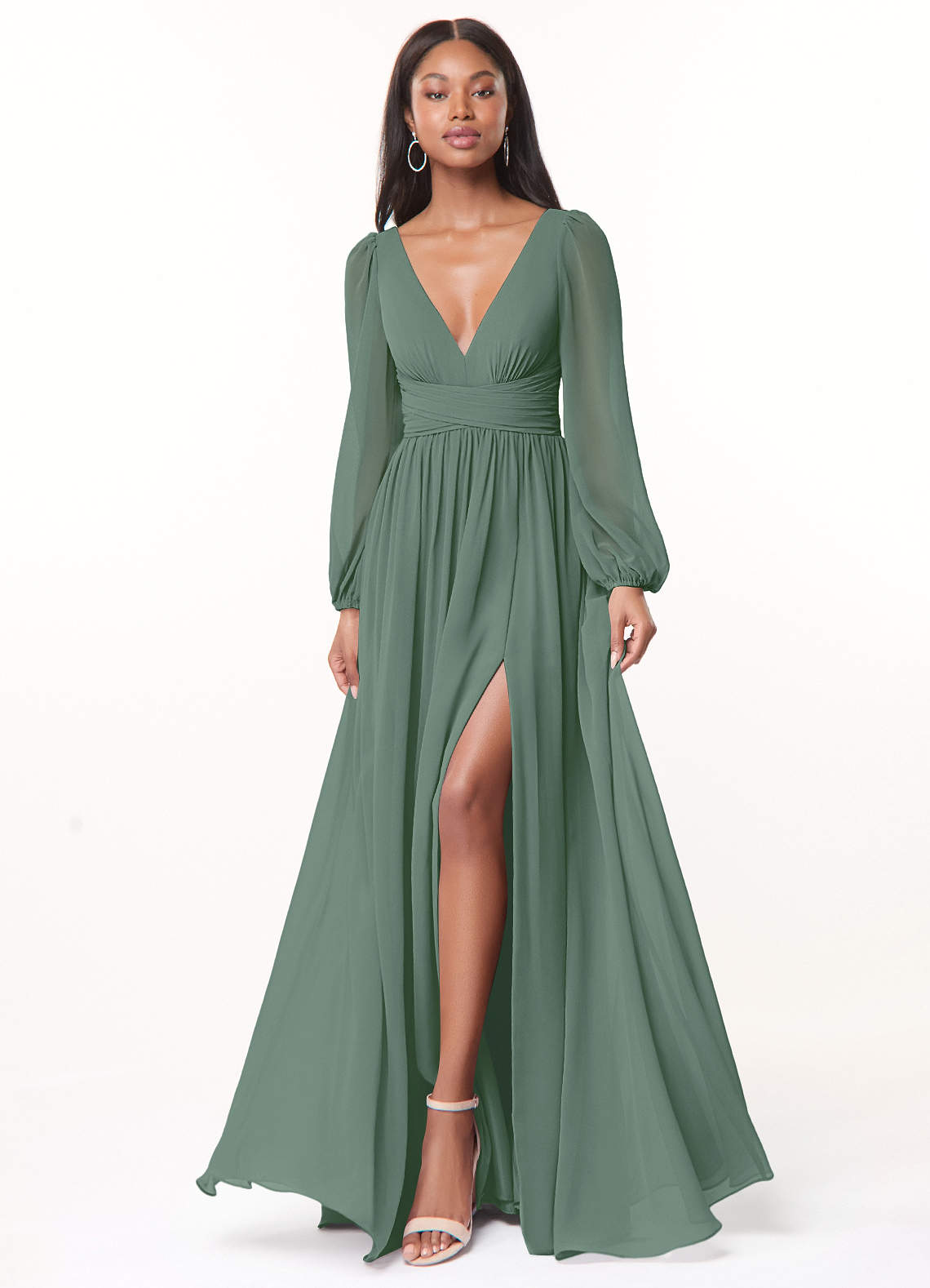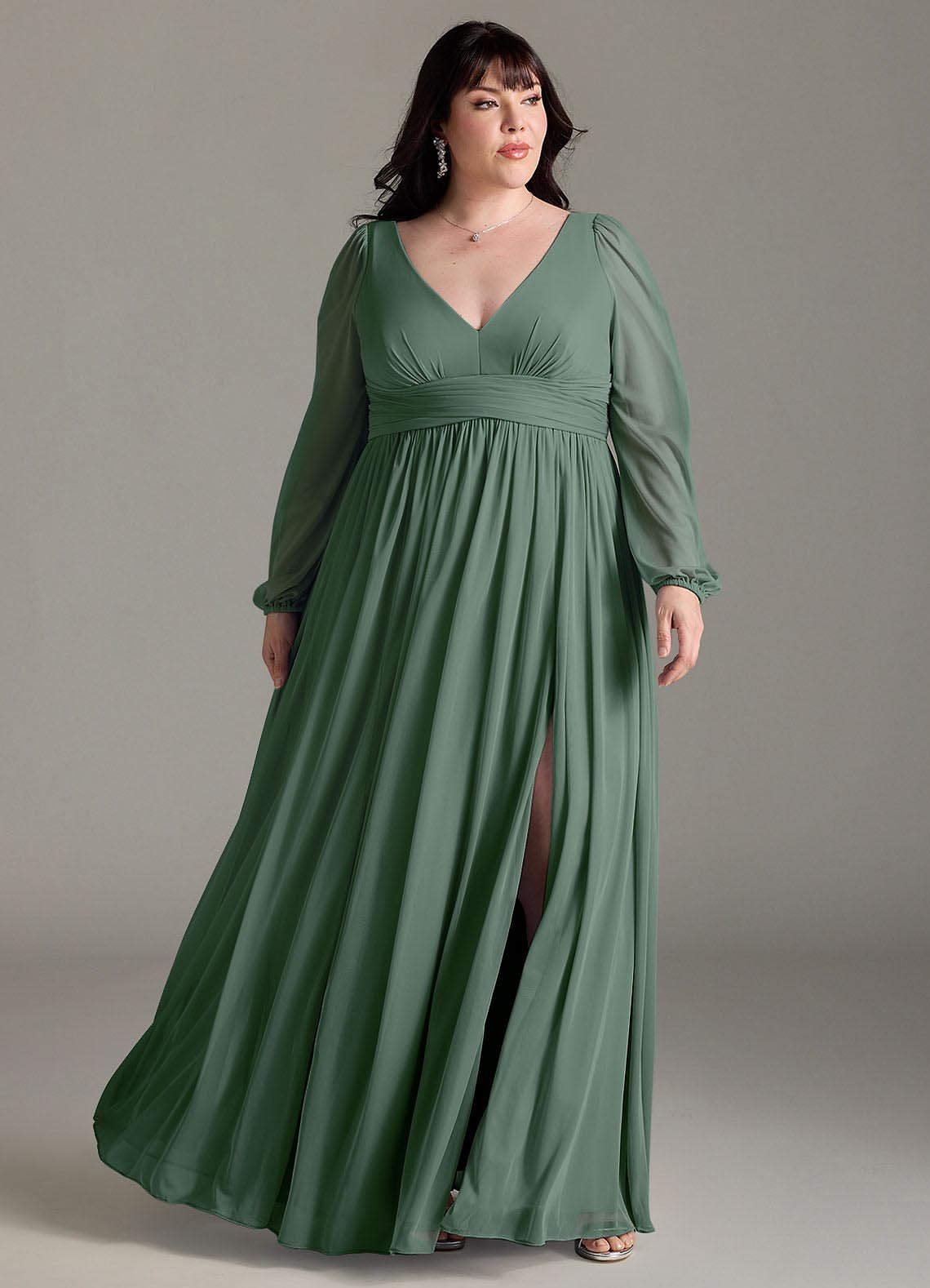 Donnez à vos demoiselles d'honneur un look à leur meilleur en portant notre robe trapèze en mousseline, Norah. Son décolleté en V présente des fronces délicates avec une taille empire plissée. Les manches longues du blouson complètent le corsage. La jupe trapèze froncée coule à chaque pas grâce à la fente sur la jambe.