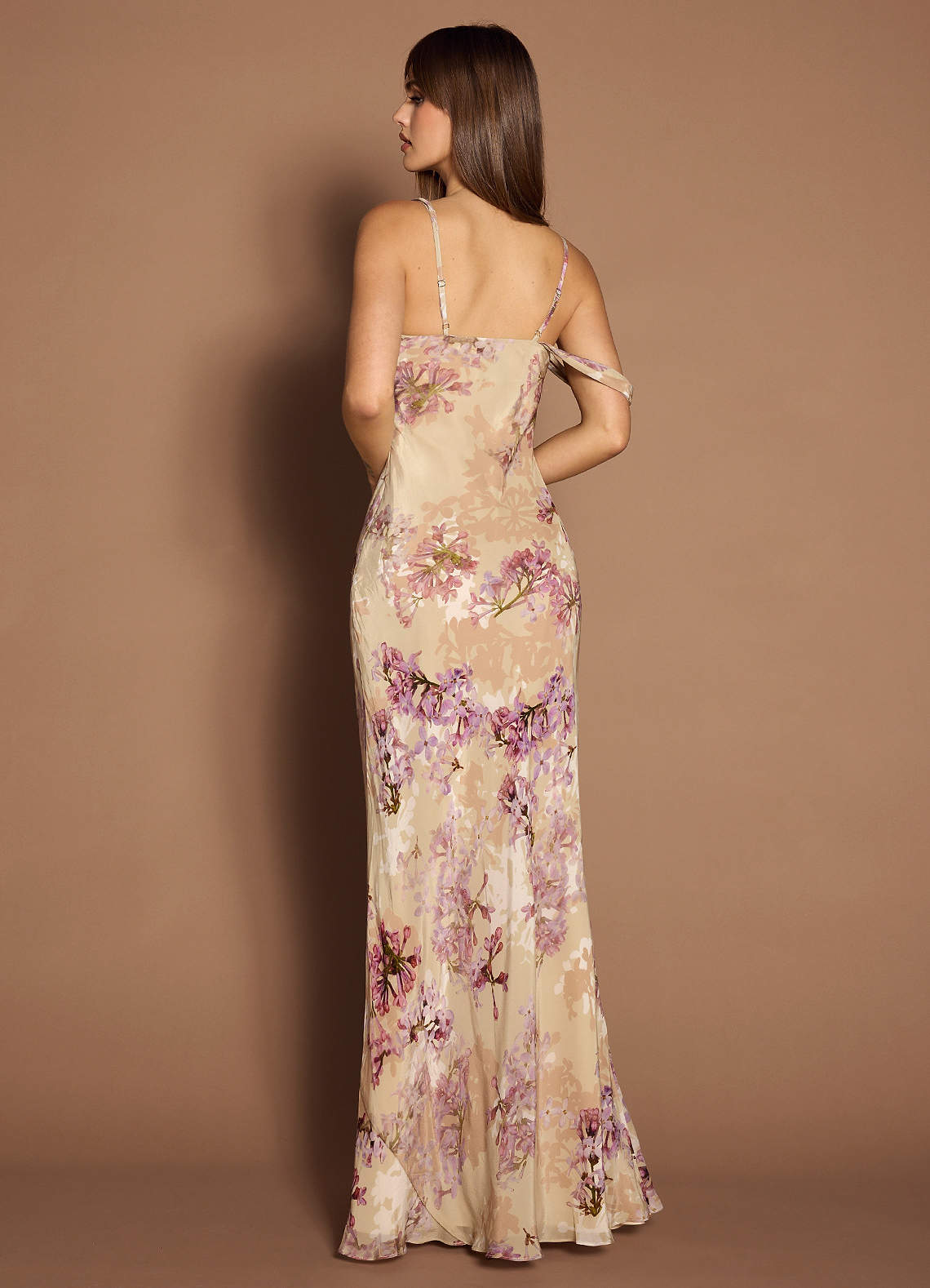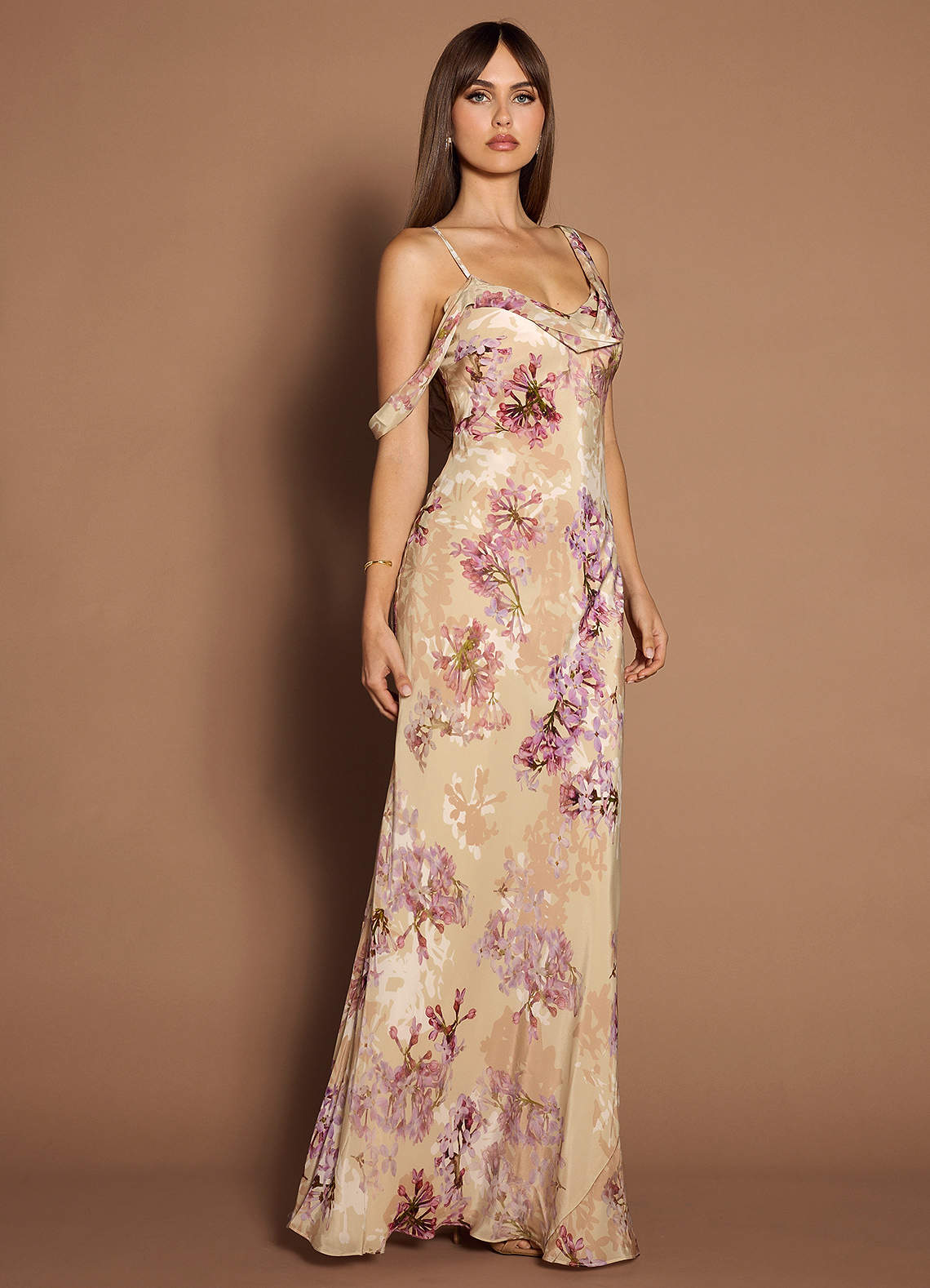 La robe longue Norie est un modèle féminin en georgette associant un col bénitier, des manches à épaules dénudées et une jupe fourreau longue. Portez-la pour un mariage ou votre prochaine réception.