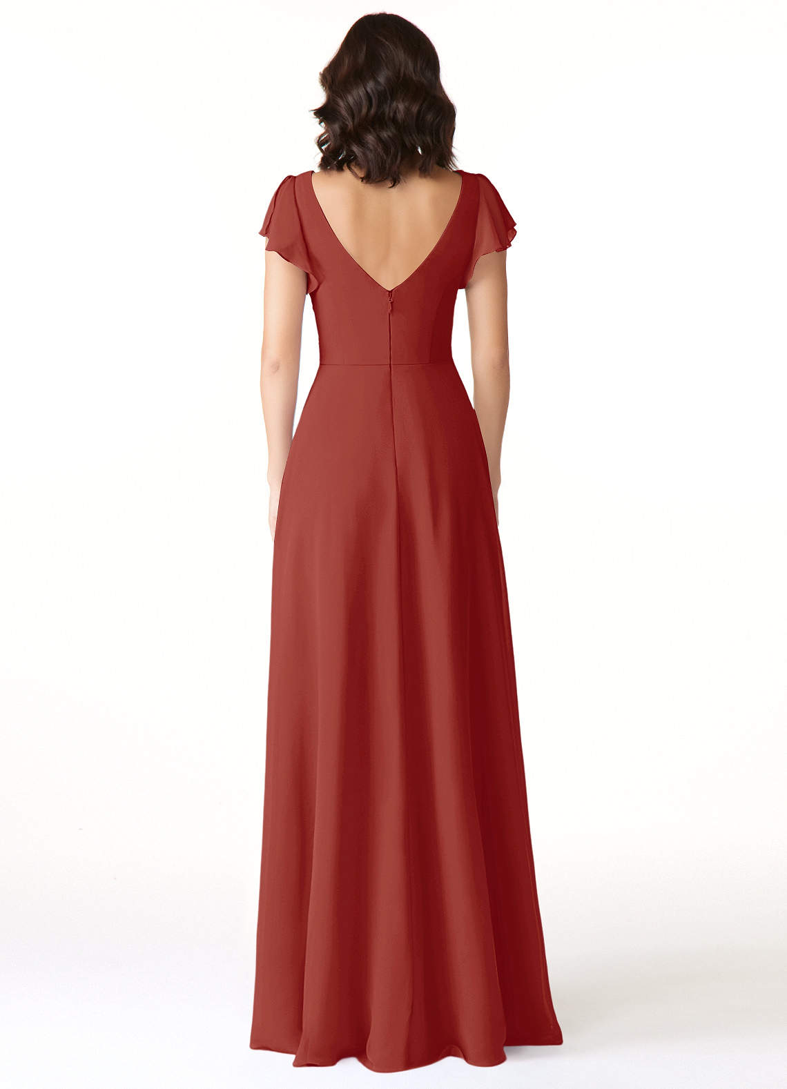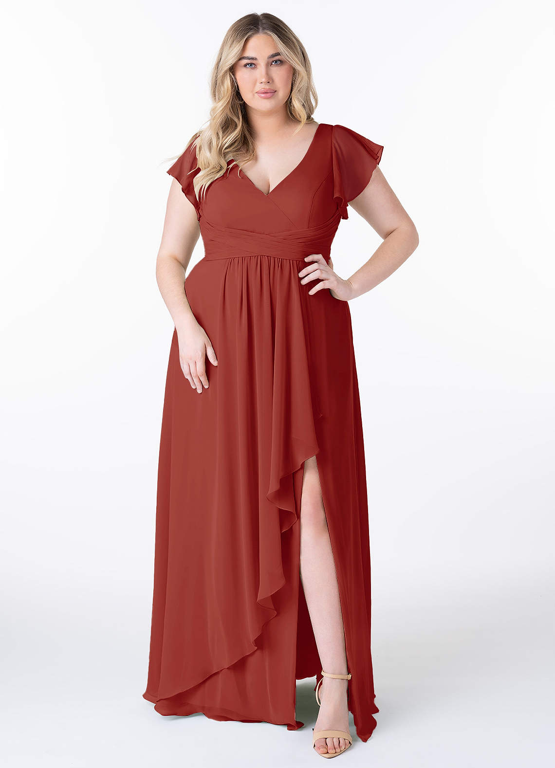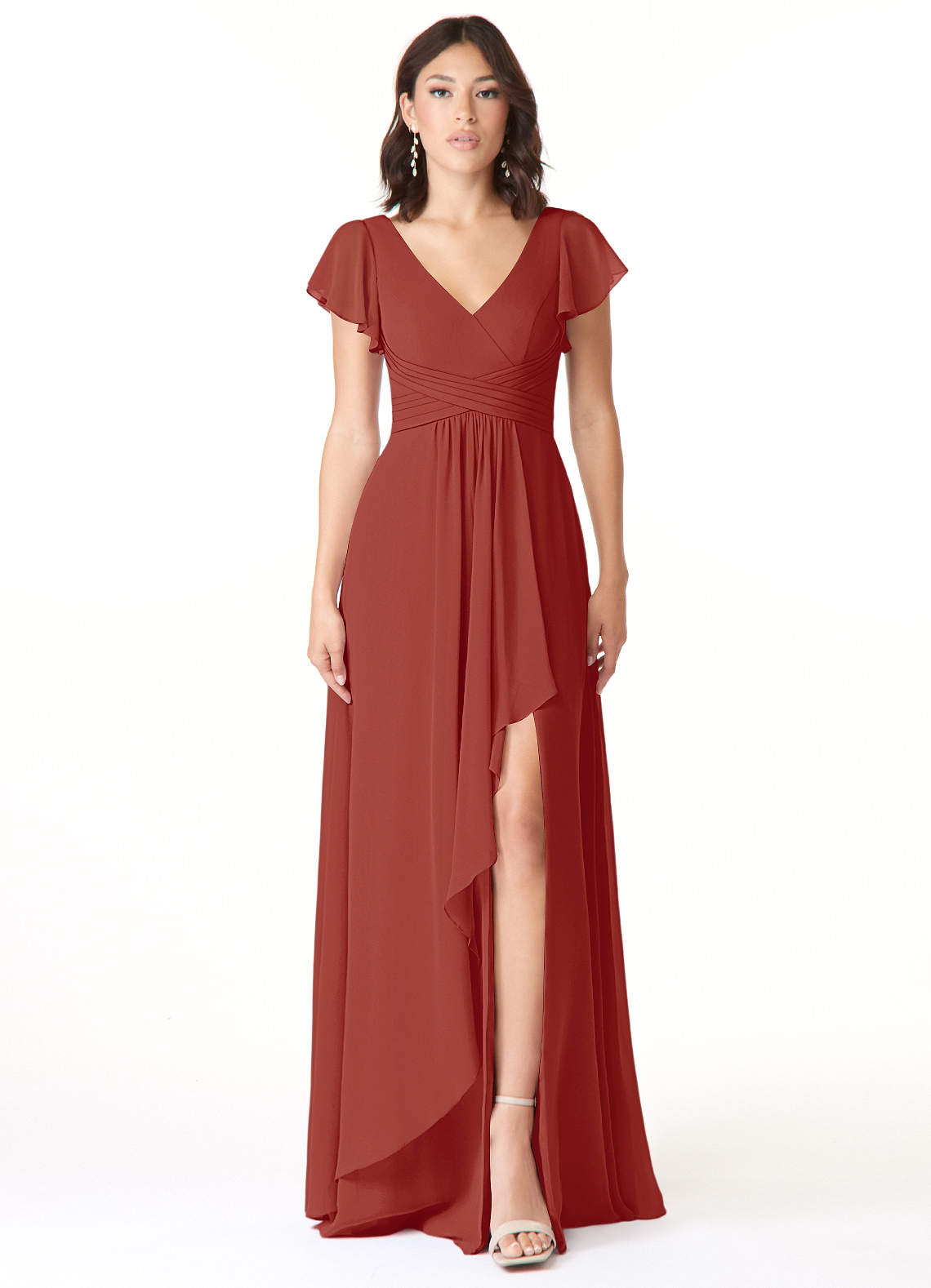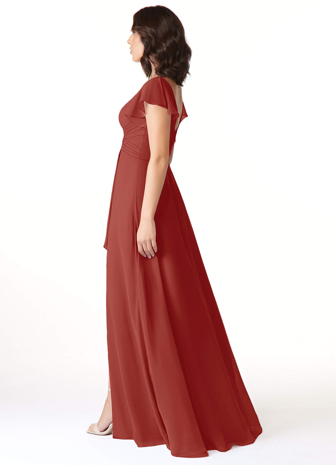 Dansez toute la nuit avec Omari, notre robe de demoiselle d'honneur trapèze en mousseline. Elle présente des manches flottantes, un corsage plissé qui mène à son encolure en V et une couche de fusil drapée sur la fente de sa jambe.