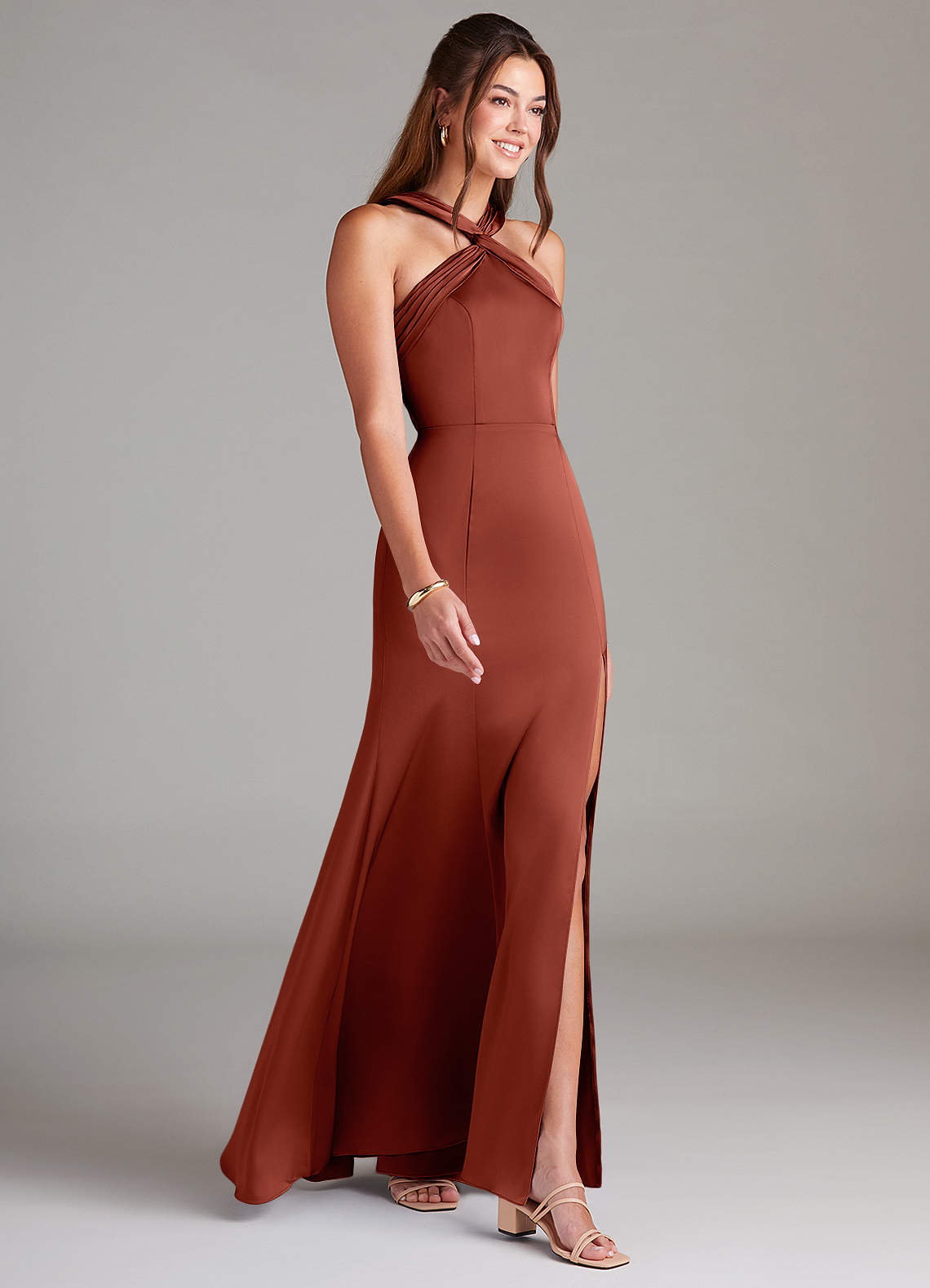 Sentez-vous comme une déesse mythique grecque en portant une robe de demoiselle d'honneur Rue. Doté d'un décolleté licou torsadé, son corsage présente un détail plissé qui se connecte aux bretelles. Ses bretelles plissées se rejoignent au milieu du corsage arrière avec une fermeture à crochet et œil, créant une découpe dans le dos. Fabriquée en satin extensible, sa silhouette sirène longue au sol est terminée par une fente pour la jambe.