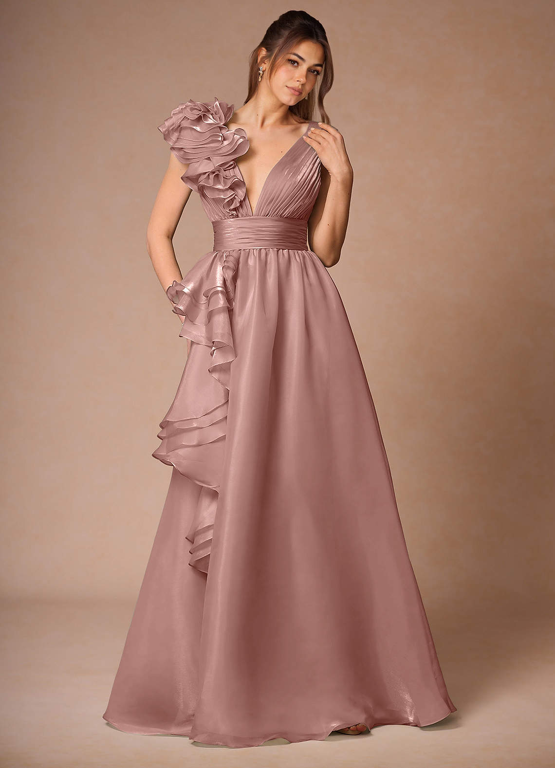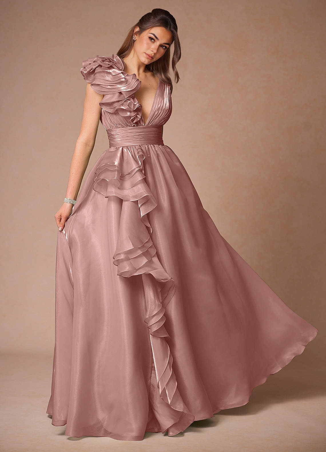 La robe à volants Vespera est une déclaration confiante et glamour. Cette robe longue à col en V est confectionnée en mousseline satinée, avec de magnifiques volants mouchoirs en cascade sur la jupe volumineuse. Portez ce look séduisant lors de votre prochain événement officiel.